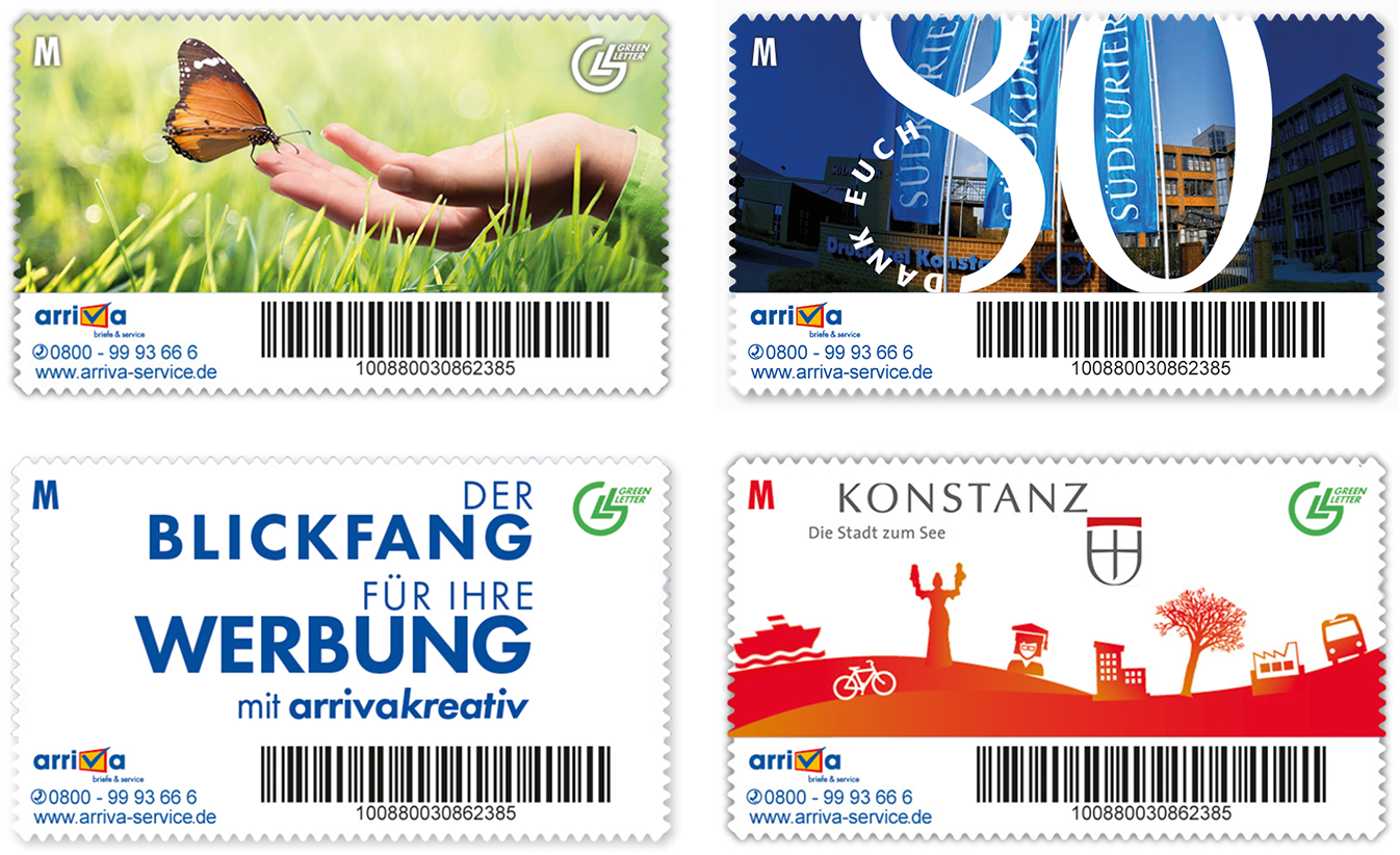 Mit arrivakreativ können Sie Ihre Labels ganz individuell und stilvoll gestalten. Ob Firmenlogo, Produktteaser oder Stimmungsbild – immer perfekt abgestimmt auf Events, Jubiläen oder Produkteinführungen. Ihrer Kreativität sind keine Grenzen gesetzt! Und: Die individuellen Labels sind sogar für alle Wertstufen verfügbar. Wir sorgen mit arriva kreativ dafür, dass Ihre Briefe nicht nur ankommen, sondern auch im Gedächtnis bleiben.